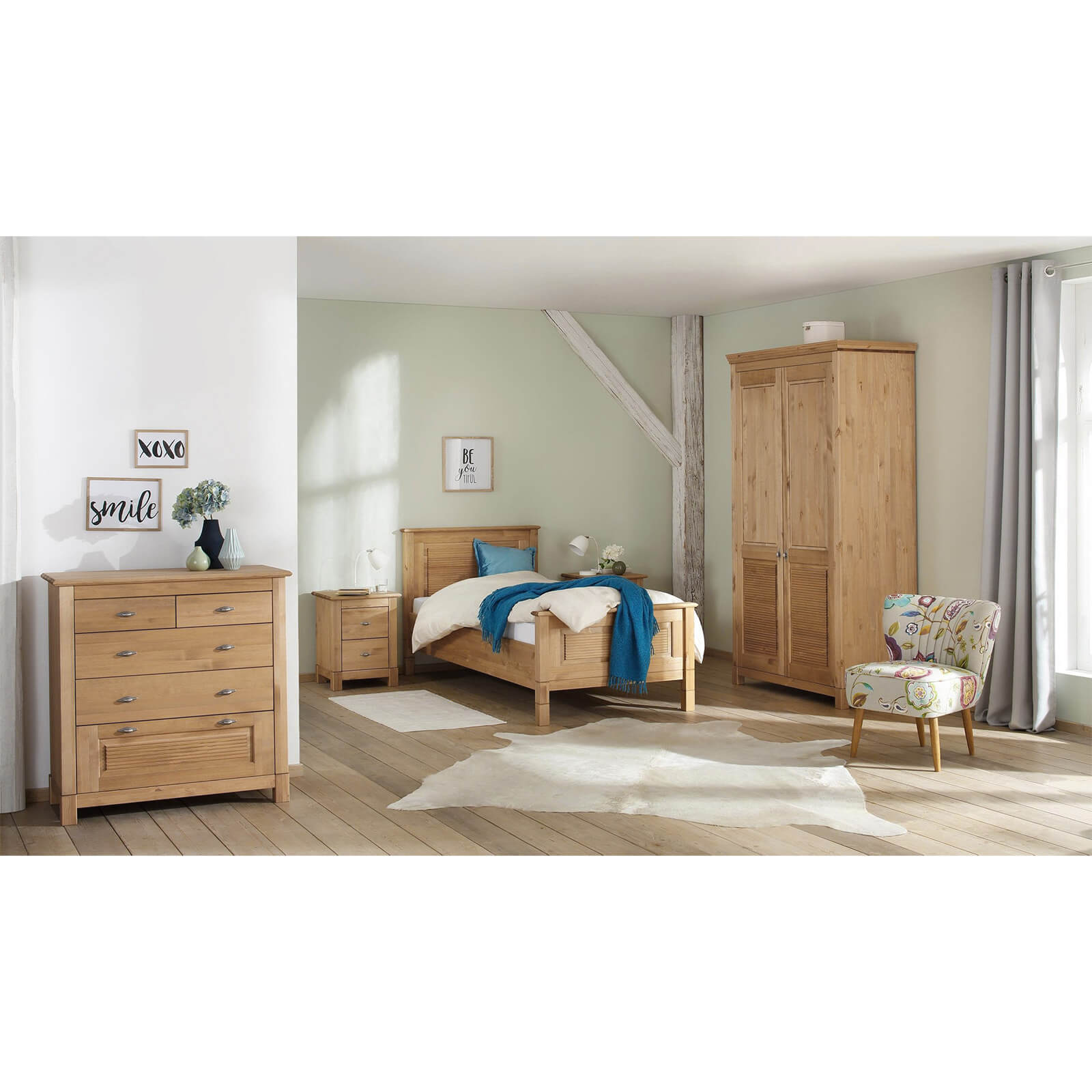 В комплект для спальни Рауна 1 (90х200) Бейц/масло входит: Комод Рауна 221 Бейц/масло, Тумба прикроватная Рауна 02 (2 шт.) Бейц/масло, Кровать Рауна (90х200) Бейц/масло, Шкаф для одежды Рауна 20 Бейц/масло.