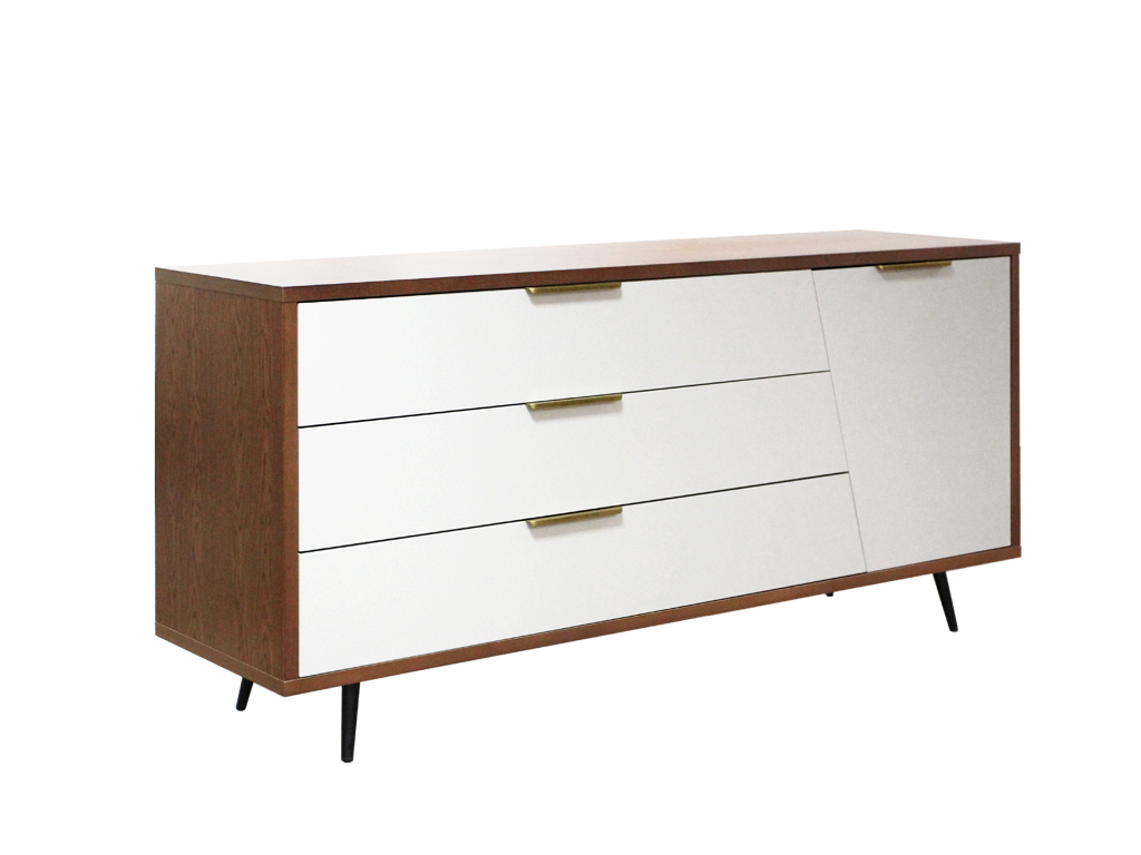Наружные детали каркасов изделий изготовлены из облицованной шпоном ДСП, внутренние – из ламинированной ДСП, фасады — из окрашенной МДФ, детали выдвижных ящиков – из обтянутой плёнкой ДСП, дно ящиков и задние стенки – из окрашенной ХДФ. Опоры стальные.