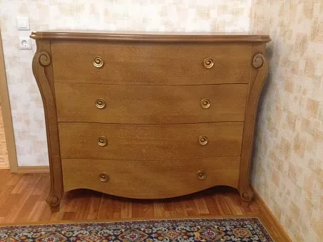 Плавные линии, изогнутые поверхности, изящные ножки придают спальне утончённость и женственность. Кровать манит к себе мягкой спинкой, очаровывает и не отпускает. Изящный туалетный столик с секретом, когда часть крышки лёгким движением руки становится зеркалом. Изделия имеют несколько цветовых решений: классический благородный — «коньяк», нежный, утончённый – «белая эмаль с серебряной патиной» и неординарный, удивительный – «кракелюр».