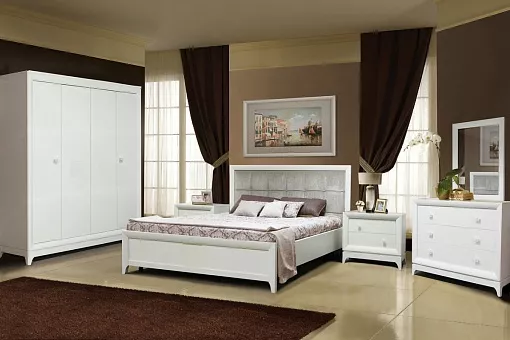 Украшает набор витиеватый рисунок в квадрате, повторяющийся в каждом изделии, что всё вместе создаёт единую композицию, показывает индивидуальность и неповторимость набора. Цокольное основание изделий на профильных ножках, приподнимает изделия над поверхностью. В кровати на основании из брусков ложится рама с ламелями, возможно регулирование матраца по высоте, с помощью комплекта фурнитуры на царгах. Основание к кровати в стоимость не входит.