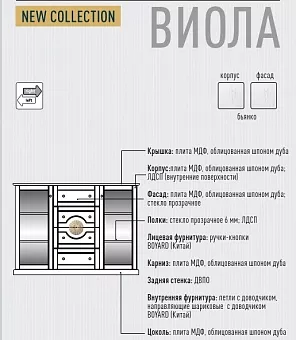 Все фасады серии Виола выполнены из качественного МДФ высшей категории с покрытием натуральным шпоном дуба. корпус выполнен по такой ше технологии. Декоративный элемент на фасаде изготовлен из литого полиуретана. Вся серия комплектуется современной фурнитурой производства Боярд - петли с доводчиками на дверках и ящики с доводчиками на современных направляющих системах.Кровати укоплектованы решеткой для матраса. При покраске используются итальянские лаки и современная система ультрафиолетовой сушки. Текстура дерева хорошо просматривается на фасадах издлеия что полностью показывает натуральность покрытия изделия натуральным шпоном дуба а мдф гарантирует вечьность и стабильность изделия при любых температурных перепадах что плачевно сказвается для изделий из полностью массива дерева. Очередной шедевр белорусской мебели ит фабрики Гомельдрев - мебель из массива дерева и комбинированных материалов. Прекрасная серия Виола в современном стиле для гостиной и спальни.