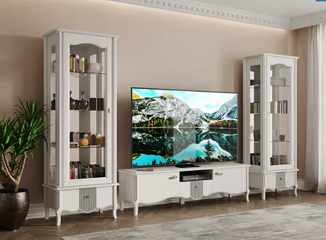Набор выполнен с использованием шпона и массива дуба на лицевых поверхностях. Украшают набор: фигурный набор шпона, декоративные элементы с выдавленными полосками, подчёркивающими структуру древесины, волнообразные кромки нижних деталей, объёдиняющие все изделия в единую композицию. Зеркало навесное овальной формы прекрасно сочетается с таким же по конфигурации на шкафу. Внутренние поверхности деталей облицованы плёнкой с финиш-эффектом. Крышки из плиты ДСП, облицованной шпоном и бруском дуба с профильным фрезерованием по лицевым кромкам.