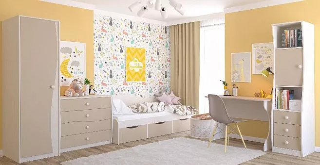 Мебель для молодежной комнаты Комби изготовлена фабрикой Неман. Серия выполнена в приятных кремово-кофейных тонах, с сочетанием светлой фактуры дерева корпуса и матовых однотонных фасадов цвета «капучино», что добавит теплоты и уюта в Ваш интерьер. Дополнительный модуль - выдвижной ящик для