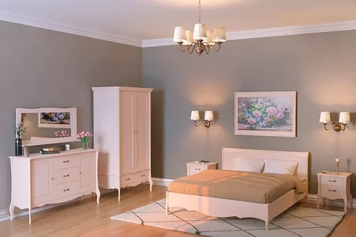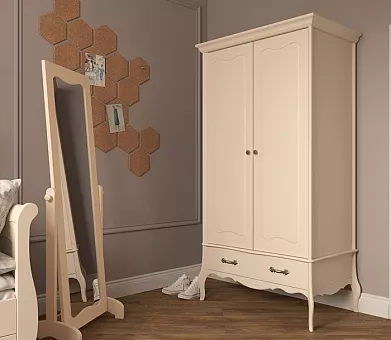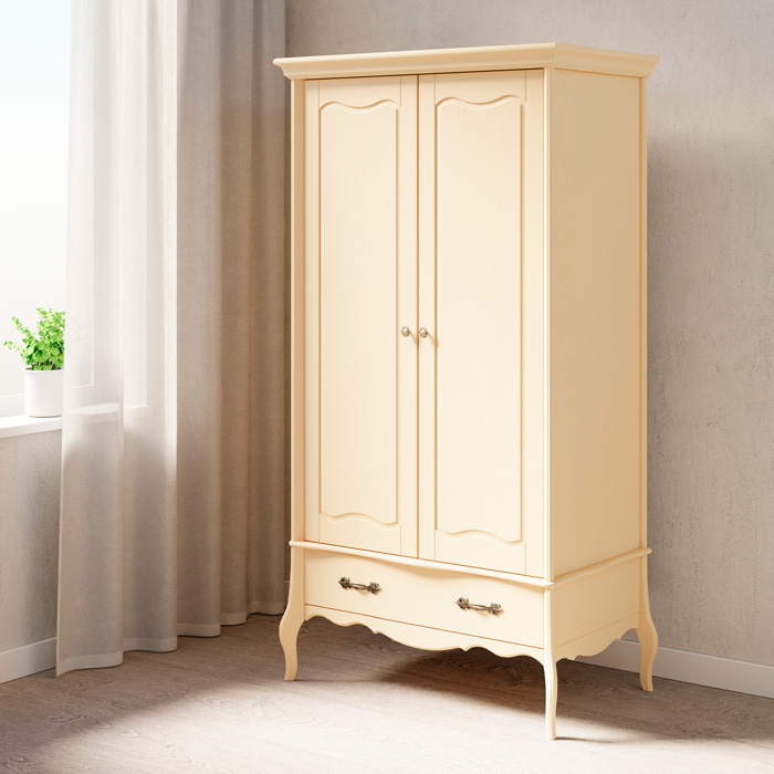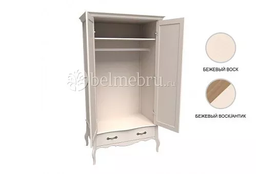 Шкаф с 2 дверями и ящиком из массива сосны. Покрытие - укрывистый бежевый воск или бежевый воск/антик, в цвет антик выкрашен карниз. Структура древесины почти не просматривается. Шкаф имеет одно отделение за дверями, полку и штангу под ней для одежды, ящик на направляющих Blum с доводчиками. Возможна установка дополнительных полок и ящиков для белья (приобретаются отдельно).