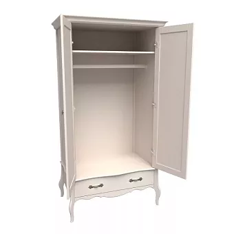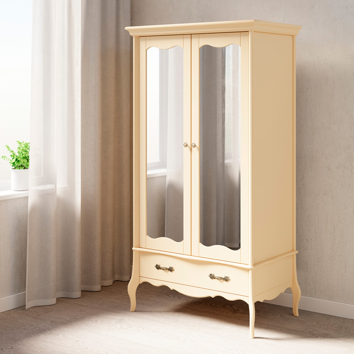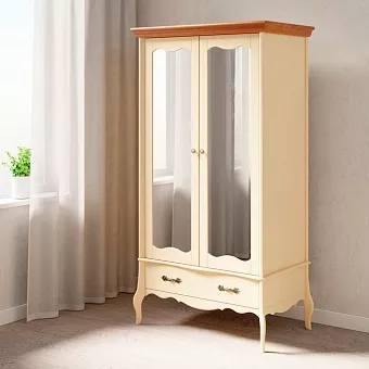 Шкаф с двумя зеркальными дверями. Шкаф имеет одно отделение за дверями, ящик на направляющих с доводчиками, полку и штангу под ней для одежды. Варианты цвета: укрывистый бежевый воск, структура древесины почти не просматривается и бежевый воск/антик в цвет антик окрашен карниз шкафа. Возможна установка дополнительных полок и ящиков для белья (приобретаются отдельно).