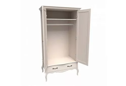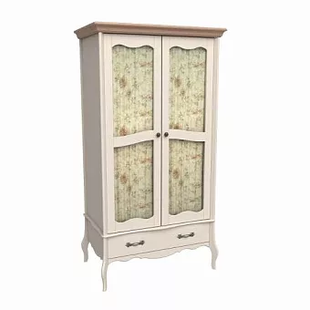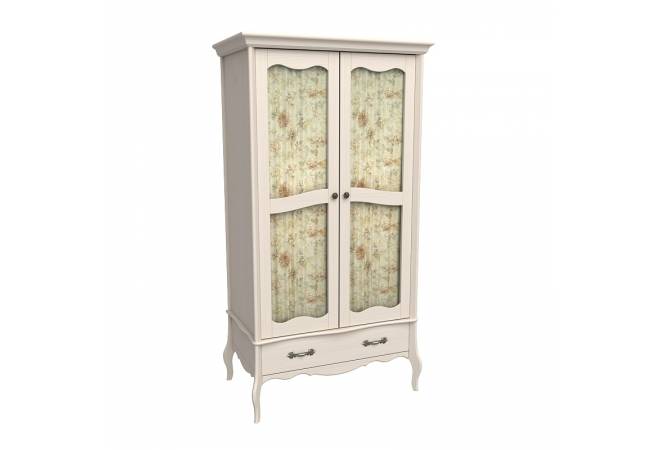 Шкаф с 2 стеклянными дверями и ящиком из массива сосны. Покрытие - укрывистый бежевый воск, структура древесины почти не просматривается.Шкаф имеет одно отделение за дверями, полку и штангу под ней для одежды, ящик на направляющих Blum с доводчиками. Возможна установка дополнительных полок и ящиков для белья (приобретаются отдельно). Декоративные шторы в комплект не входят.