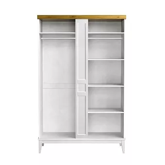 Шкаф оснащен распашными дверями, которые удобно открываются, предоставляя легкий доступ к содержимому. Внутреннее пространство шкафа продумано до мелочей: здесь достаточно места для хранения одежды, постельного белья или других вещей. На высоких ножках шкаф визуально "поднимает" пространство, что создает ощущение легкости и позволяет легко очищать полы под ним.