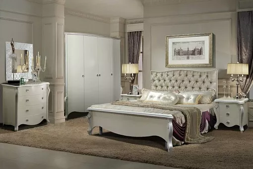 Плавные линии, изогнутые поверхности, изящные ножки придают спальне утончённость и женственность. Кровать манит к себе мягкой спинкой, очаровывает и не отпускает. Изящный туалетный столик с секретом, когда часть крышки лёгким движением руки становится зеркалом. Изделия имеют несколько цветовых решений: классический благородный — «коньяк», нежный, утончённый – «белая эмаль с серебряной патиной» и неординарный, удивительный – «кракелюр».
