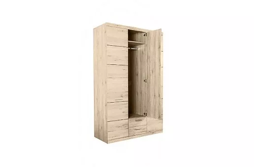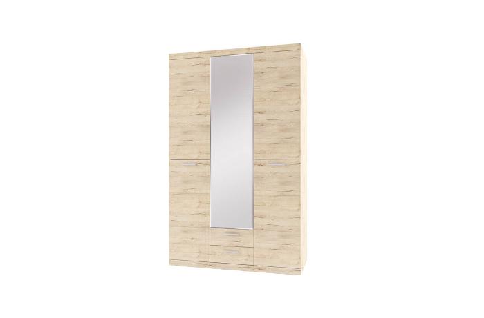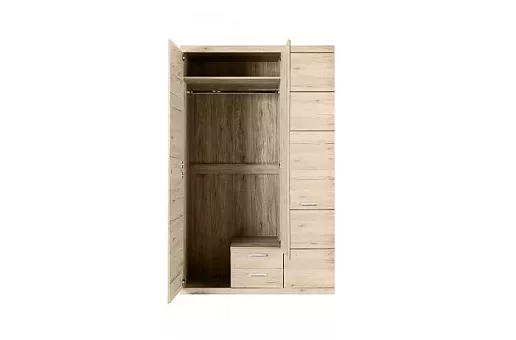 Шкаф 3D2S Z OSKAR – замечательное дополнение для организации спальни в стиле кантри. Глубокий древесный рисунок и цвет плиты подчёркнут уютную обстановку. Уникальность элементу придают сборные фасады. Шкаф 3D2S Z имеет прямую конструкцию. Конструкция элемента представляет собой одно гардеробное отделение с одной штангой и нишей сверху за двумя глухими дверями, одно отделение с полками из ЛДСП за глухой дверью, два выдвижных ящика (2S). Двери (3D) распашные, крепятся на петли к боковому корпусу и внутренней перегородке. На средней двери (снаружи) крепится зеркало (Z).