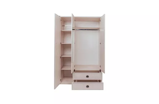 Шкаф 3DG2S MAGELLAN. Восхитительная коллекция с нотами таинственности и загадки. Коллекция MAGELLAN создаст в интерьере целый сюжет в морском стиле. Шкаф 3DG2S – оригинальное и продуманное решение для организации хранения вещей в спальне. Прекрасно подойдёт для помещений с низкими потолками, не будет перегружать пространство, так как высота изделия – 2028 мм. Шкаф 3DG2S имеет прямую конструкцию. Конструкция элемента представляет собой одно гардеробное отделение с нишей за двумя глухими дверями, одно отделение со стационарной штангой и полками из ЛДСП за глухой дверью, два вместительных выдвижных ящика (2S). Двери (3D) – распашные, крепятся на петли к боковому корпусу и внутренней перегородке. На внутреннюю сторону центральной двери крепится зеркало.
