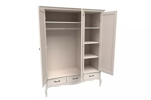 Шкаф имеет два отделения, правое узкое отделение с полками, левое широкое с полкой и штангой для одежды. Три ящика на направляющих Blum с доводчиками. Варианты цвета: укрывистый бежевый воск, структура древесины почти не просматривается и бежевый воск/антик в цвет антик окрашен карниз шкафа. Возможна установка дополнительных полок и ящиков для белья (приобретаются отдельно).