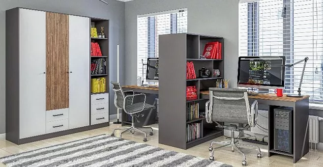 Коллекция Мальма для кабинета или молодежной комнаты создана белоруской фабрикой Неман. Выполнена в стиле минимализм, что характерно для этого стиля: функциональность и нейтральное цветовое сочетание.