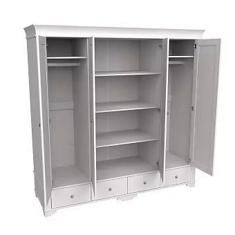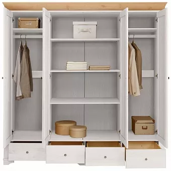 Шкаф из массива сосны. Имеет 3 отделения: правое и левое отделения с полкой и штангой под ней, среднее широкое отделение имеет 3 полки, которые регулируются по высоте. Под каждой дверью имеется выдвижной ящик на роликовых направляющих.