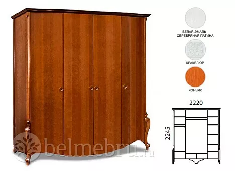 Отделка: цвета — « коньяк», «белая эмаль + серебристая патина», «кракелюр», лак – на водной основе.