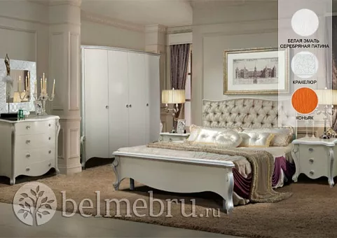 Плавные линии, изогнутые поверхности, изящные ножки придают спальне утончённость и женственность. Кровать манит к себе мягкой спинкой, очаровывает и не отпускает. Изящный туалетный столик с секретом, когда часть крышки лёгким движением руки становится зеркалом. Изделия имеют несколько цветовых решений: классический благородный — «коньяк», нежный, утончённый – «белая эмаль с серебряной патиной» и неординарный, удивительный – «кракелюр».