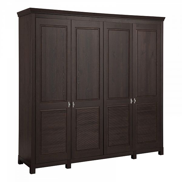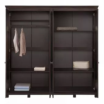 Внутри широкое отделение со штангой и местом под головные уборы, а также четыре вместительные полки для других вещей. Распашные двери – глухие, но с оригинальным декором.