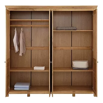 Внутри широкое отделение со штангой и местом под головные уборы, а также четыре вместительные полки для других вещей. Распашные двери – глухие, но с оригинальным декором.