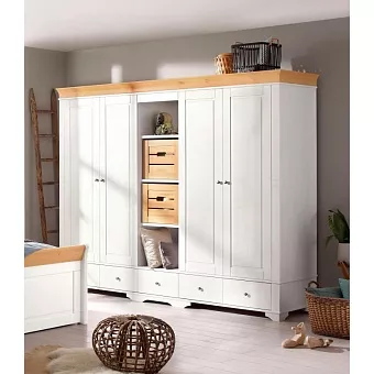 Шкаф из массива сосны. Имеет 3 отделения: правое и левое широкие отделения с полкой и штангой под ней, среднее открытое отделение имеет 3 полки, которые регулируются по высоте. Под каждой дверью имеется выдвижной ящик на роликовых направляющих.