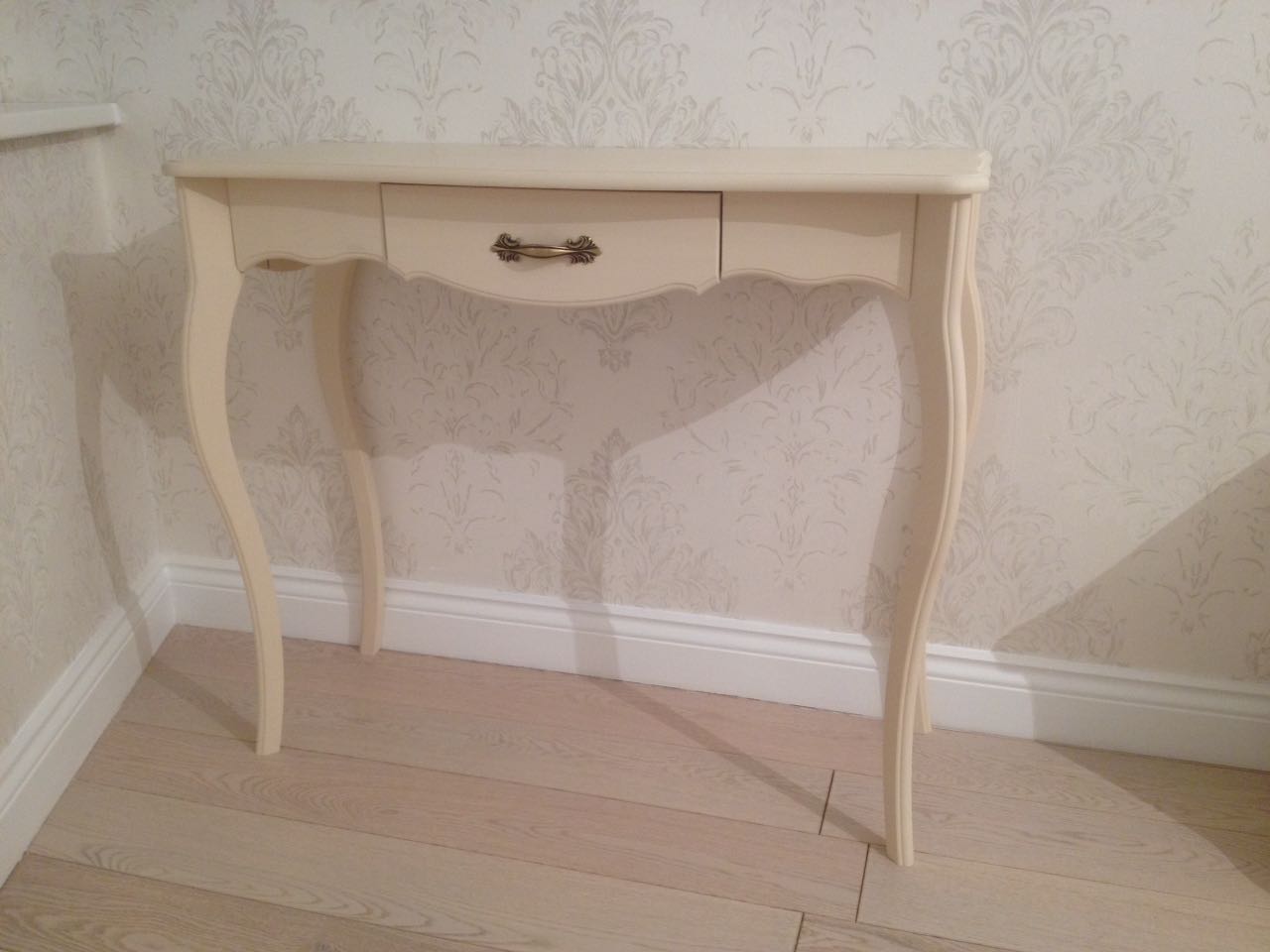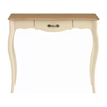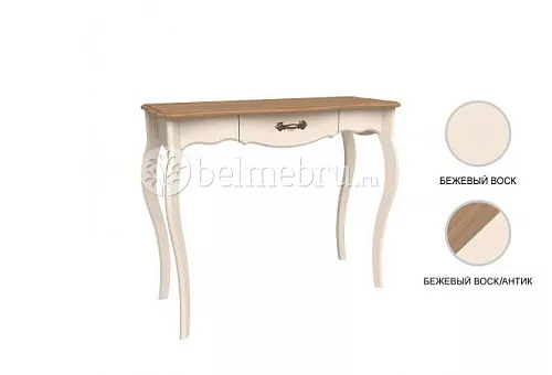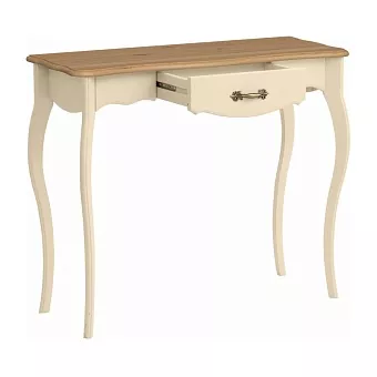 Консоль из массива сосны. Покрытие - укрывистый бежевый воск или бежевый воск/антик, столешница цвета антик. Структура древесины почти не просматривается. Выдвижной ящик на шариковых направляющих.