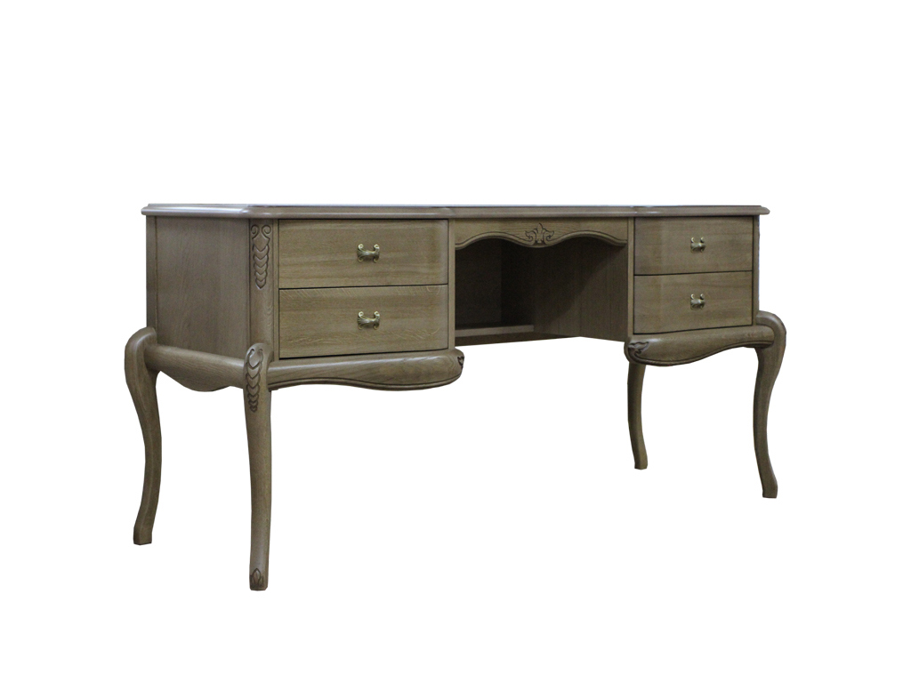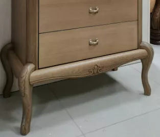 Набор выполнен с использованием массива дуба и шпона дуба. Украшает изделия лицевая фурнитура, подобранная в тон к цвету изделия, витиеватая резьба, объёмный вид накладок ящиков.