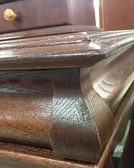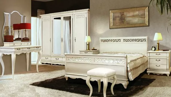 Изогнутые линии, искусно вырезанное кружево из дерева, налёт старины делают спальню безупречно красивой, солидной, удобной. Кроме классического варианта — шкаф, кровать, тумба прикроватная, комод, здесь Вы найдёте и многофункциональный туалетный стол с трёхстворчатым зеркалом – трильяж, и банкетку, и сундук на котором приятно сидеть и можно хранить постельные принадлежности.