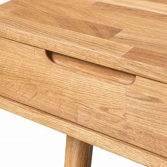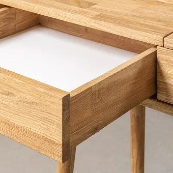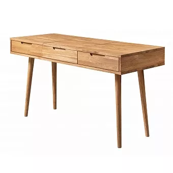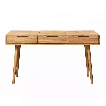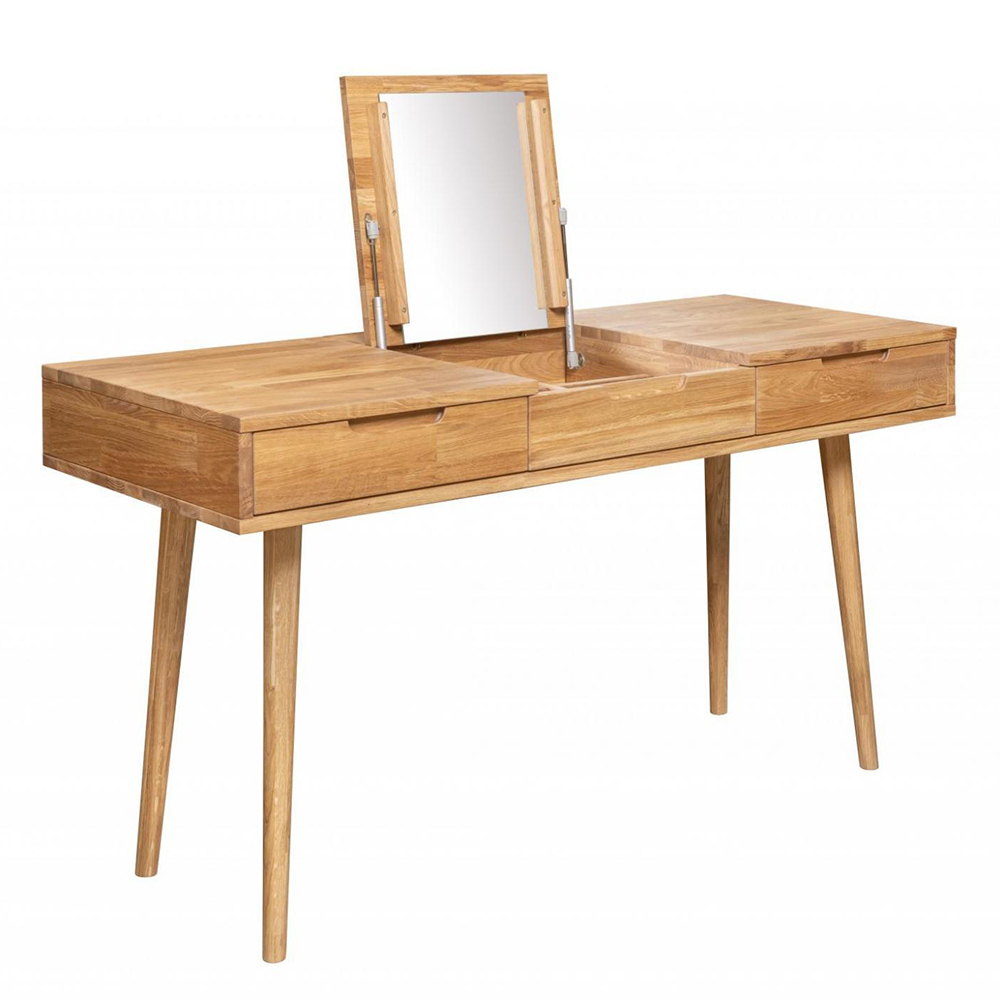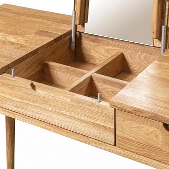 Туалетный стол имеет три выдвижных ящика и откидное зеркало. Он легко впишется в любую спальню в скандинавском стиле. Используется 100% массив дуба. Покрытие интерьерными маслами от компании Хенкель. 100% ЭКО отделка, масла не выделяют никаких токсичных частиц. Гарантия защиты и долговечности древесины, сохранение ее текстуры, внешнего вида и естественности. Каркас-массив дуб, фасад- массив дуб. Задняя стенка, дно ящиков - фанера, облиц. шпоном дуб.