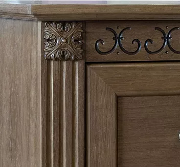 Серия Ярослава выполнена в классическом стиле, в цвете орех. Предметы выполнены из массива дуба и покрыты натуральным дубовым шпоном. Комод, зеркало и прикроватная тумба выполнены из МДФ со шпоновым покрытием, ЛДСП. Фасад натуральный шпон дуба; МДФ; ДСтП. Каркас натуральный шпон дуба; МДФ; ДСтП. Фотографии могут не передавать точный цвет мебели.