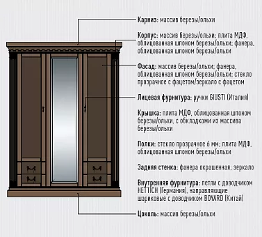 Каркас: клееный массив древесины (береза, ольха), шпонированная МДФ с обкладками из массива (береза, ольха)
