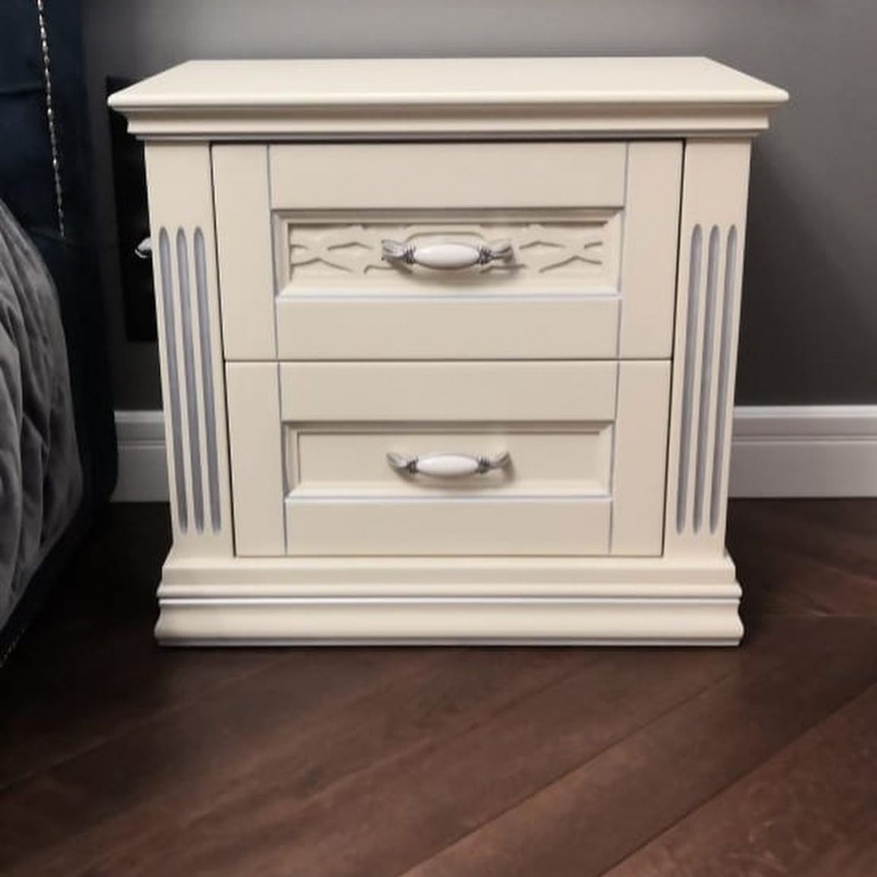 Тумбочка Верона выполнена из бук+МДФ, в классическом стиле. Имеет два выдвижных ящика. Направляющие на ящиках Boyard в базовой комплектации без доводчиков. Дополнительно возможна установка с доводчиками и патинирование эллементов на фасаде. Ручки металлические. Возможно изготовление в нестандартном размере, подробности уточняйте у менеджеров.