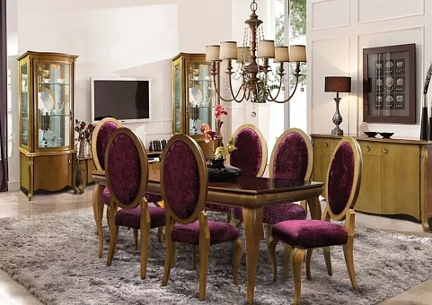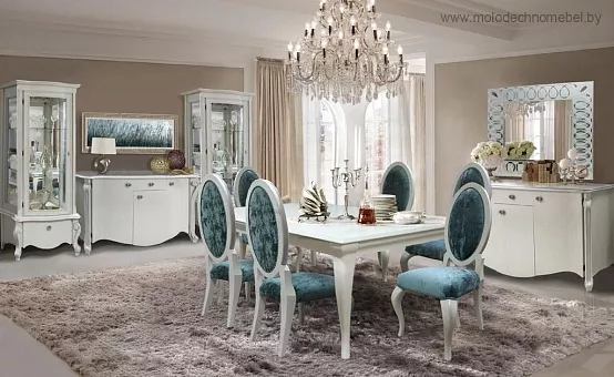 Плавные линии, изгибы, профильные поверхности придают набору лёгкость, очарование эпохи прошедших веков, при этом оставаясь удобным и практичным. Вместительные витрины, комоды не разочаруют, столовая группа из стола и стульев словно приглашает провести вечер при свечах. Изделия имеют несколько цветовых решений: классический благородный — «коньяк», нежный , утончённый – «белая эмаль с серебряной патиной» и неординарный, удивительный – «кракелюр».