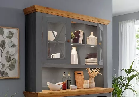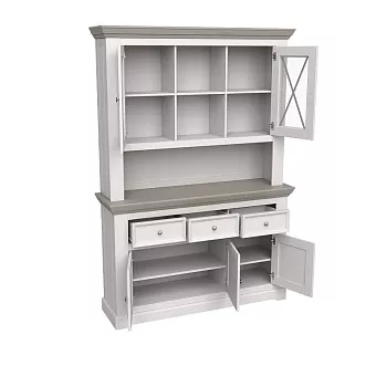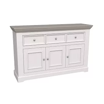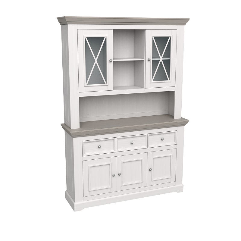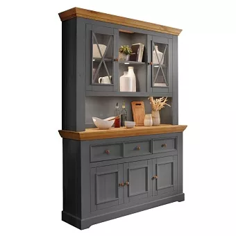Большой буфет Форест из массива сосны. Состоит из комода с 3 дверками и 3 ящиками и надстройки. За дверками комода и надстройки расположено по одной полке. Для открывания ящиков и дверок используется фурнитура немецкого производства компании Hefele.