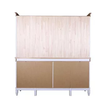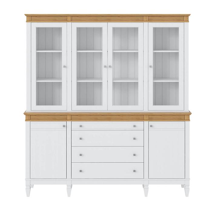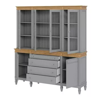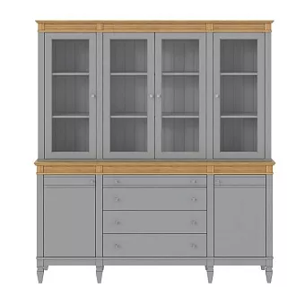 Буфет выполнен из массива сосны. Удобный и вместительный, очень прост, но при этом функционален. Отлично впишется как в обеденную так и в гостиную. Буфет визуально разделен на 3 секции которые укомплектованы шестью полками сверху за четырьмя стеклянными распашными дверями, двумя полками снизу за двумя распашными дверями и четырьмя ящиками.