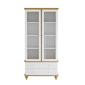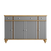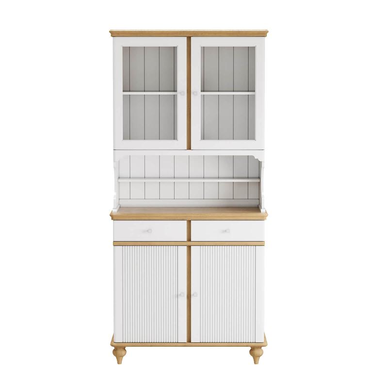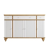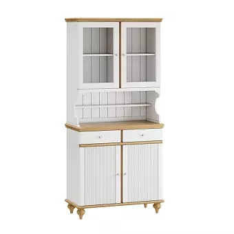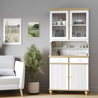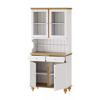 Буфет оснащен двумя распашными дверками с полками внутри и двумя ящиками снизу, двумя распашными, стеклянными, дверками сверху. Фурнитура на дверях и ящиках с доводчиками. Высокие ножки обеспечивают оптимальный доступ при уборке.
