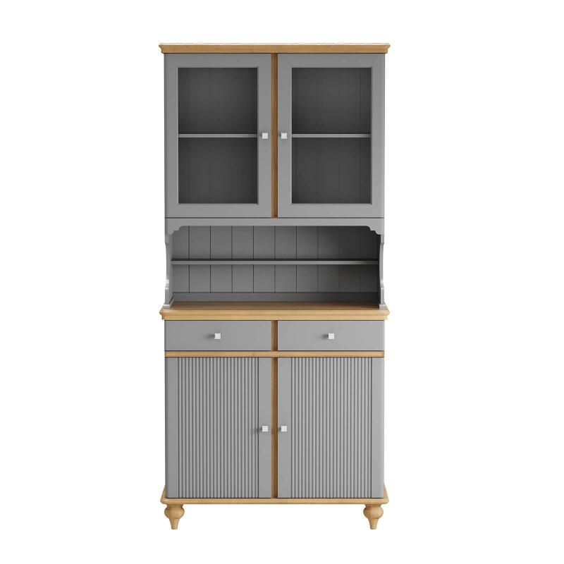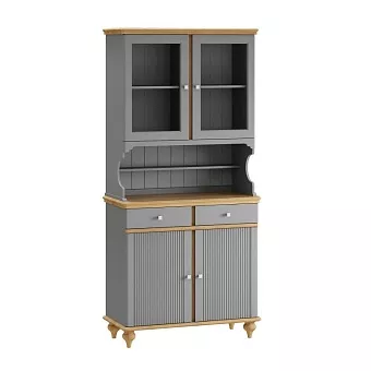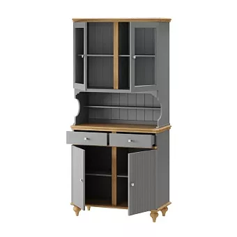 Буфет оснащен двумя распашными дверками с полками внутри и двумя ящиками снизу, двумя распашными, стеклянными, дверками сверху. Фурнитура на дверях и ящиках с доводчиками. Высокие ножки обеспечивают оптимальный доступ при уборке.