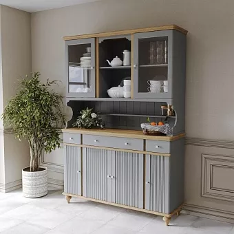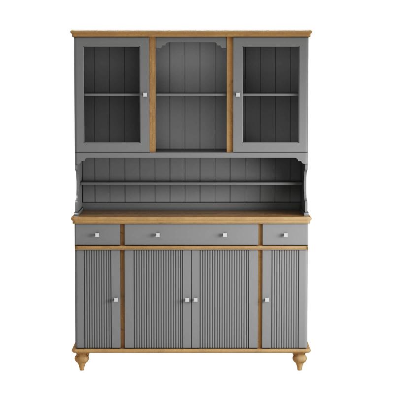 Буфет оснащен четырьмя распашными дверками с полками внутри и тремя ящиками снизу, двумя распашными, стеклянными, дверками сверху. Фурнитура на дверях и ящиках с доводчиками. Высокие ножки обеспечивают оптимальный доступ при уборке.