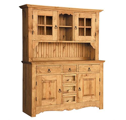 Буфет Волшебная сосна REHAUSSE 150 (RE150+GR150) выполнен из массива сосны, обладает легким ароматом смолы. Состоит из верха RE 150 и низа GR 150. Вес изделия 134 кг. Верх - две дверки, по центру ниша с одной полкой, Низ - три выдвижных ящика на деревянных полозках, а также имеется три ящика со стеклом, куда можно засыпать различные декоративные элементы: лепестки цветов, сухоцветы, зерна и т.п., по бокам две дверцы. Комплектуется металлическими ручками "груши" (7шт.). Тон мебели может отличатся от фотографии на сайте. При желании можно приобрести кованные металлические ручки в форме кольца или груши.
