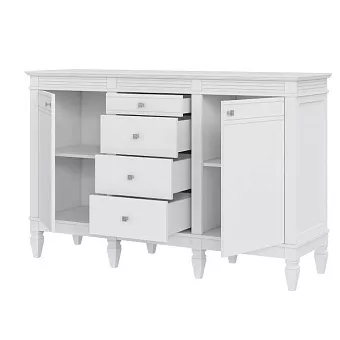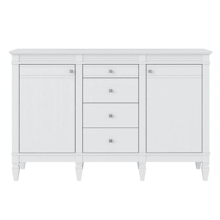 Комод оснащен двумя распашными дверками с полками внутри и четырьмя ящиками. Фурнитура на дверях и ящиках с доводчиками. Высокие ножки обеспечивают оптимальный доступ при уборке.