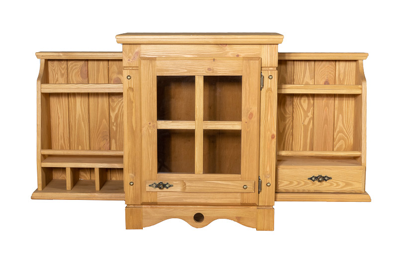 Серия мебели Хлоя из массива сосны. На крышках и и фасадных элементах толщина 3 см. толщина остальных деталей 1,5-2 см. Фурнитура выполнена из метала так же в изделии присутсвуют кованные элементы. Ящики с шариковыми направляющими. Фасады типа Жалюзи не сковозные что защищает внутренние отделения от пыли и света.