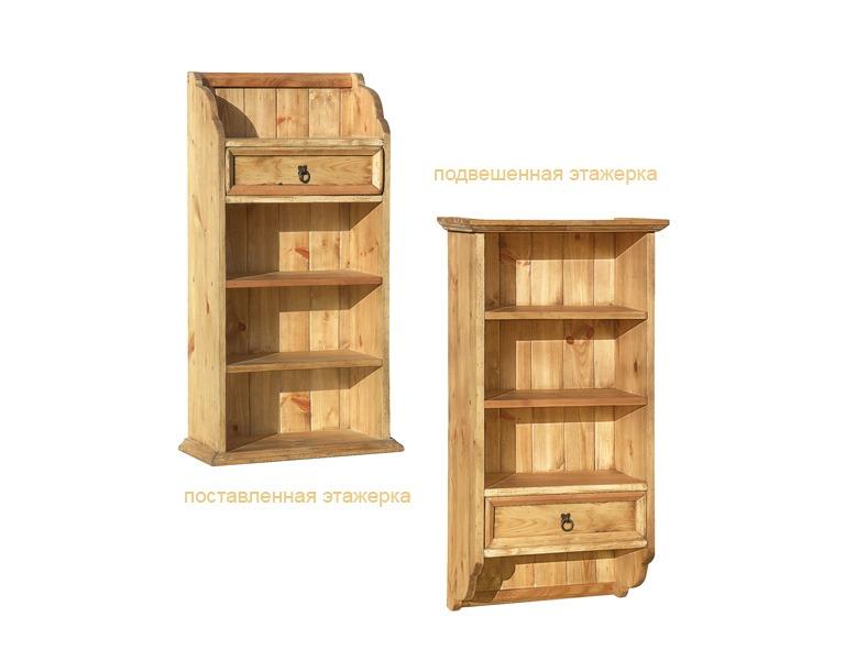 Полка с ящиком ETATIR выполнена из массива сосны, обладает легким ароматом смолы. Поставляется в собранном виде. Вес изделия 19 кг. Можно повесить на стену, либо перевернуть и поставить на пол. Имеет один выдвижной ящик. Ручки деревянные "Грибок" (1шт.). Тон мебели может отличатся от фотографии на сайте. При желании можно приобрести кованные металлические ручки в форме кольца или груши.