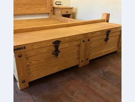 Серия мебели Хлоя из массива сосны. На крышках и и фасадных элементах толщина 3 см. толщина остальных деталей 1,5-2 см. Фурнитура выполнена из метала так же в изделии присутсвуют кованные элементы. Ящики с шариковыми направляющими. Фасады типа Жалюзи не сковозные что защищает внутренние отделения от пыли и света.