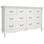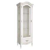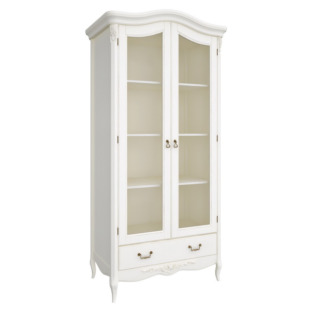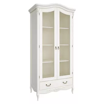 Просторный стеллаж для частной библиотеки имеет два прозрачных стеклянных фасада и пять просторных отделений для книг. Дополнительно в нижней части шкафа находятся два ящика. Стиль исполнения – французская деревенская классика, которой присущи нотки романтики, роскоши и аристократизма. В качестве основного цвета используется «слоновая кость»