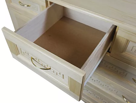 Деревянный комод "Авизия 2.7" изготавливается из мебельного клеёного щита массива натурального дерева. Металлические ручки комода подчёркивают старорусский стиль. Роликовые направляющие позволяют легко открыть или закрыть ящик, не зависимо от его загруженности. Сочетание натуральной древесины и современных эколаков - залог экологичности и безопасности мебели для дома.