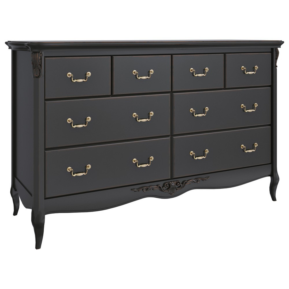 Широкий комод выполнен в стиле Прованс в немного не типичной цветовой гамме – черный антрацит. Точеные ножки с плавными изгибами удачно гармонируют со строгими контурами комода. Основным материалом является массив бука и декоративные элементы. Четыре больших и четыре малых выдвижных ящика позволит хранить множество различных вещей. Сборка не требуется.