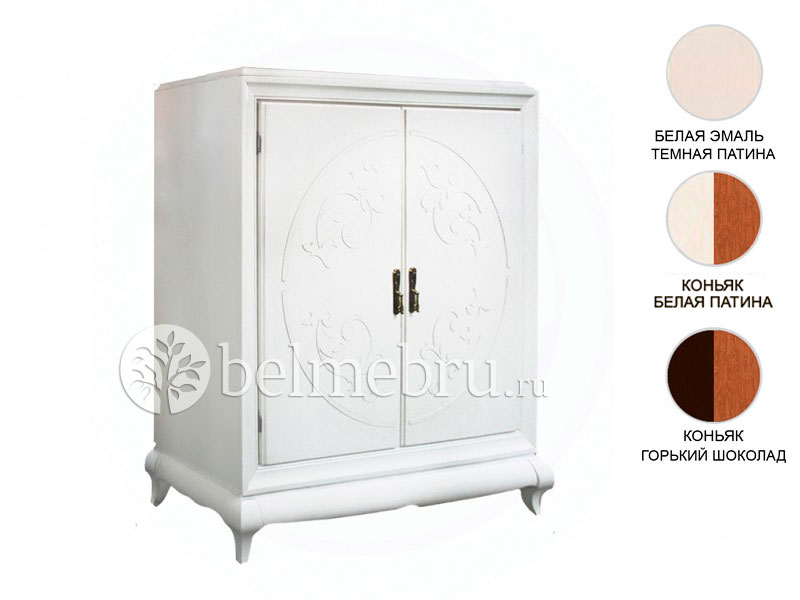 Набор выполнен с использованием массива дуба и шпона на лицевых поверхностях. Украшает набор витиеватая инкрустация деревом по дереву, повторяющаяся в каждом изделии, что всё вместе создаёт единую композицию, показывает индивидуальность и неповторимость набора. Цокольное основание изделий на профильных ножках, приподнимает изделия над поверхностью, придавая им лёгкость и радуя глаз. В ящиках вкладыши облицованные тканью. Стеклянные филёнки с декоративным узором. Тумба с откидной стеклянной дверью.