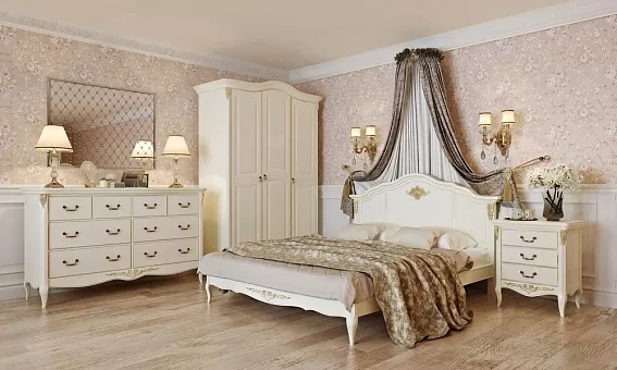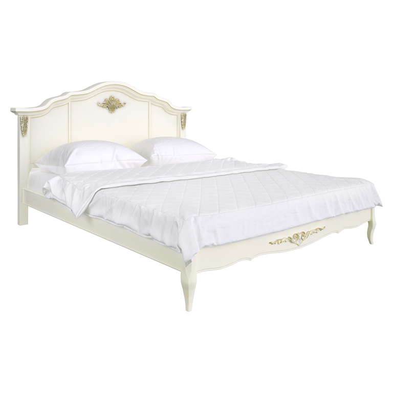 Двуспальная кровать, которая выполнена в стиле традиционной французской классики, может занять центральное место в просторной спальне. Высокое изголовье украшают сложные декоративные элементы, которые имитируют искусную резьбу по дереву. Основная расцветка «слоновая кость» дополняется золотой патиной, которая подчеркивает изысканность и роскошь кровати, придавая ей аристократические черты. Требуется сборка.