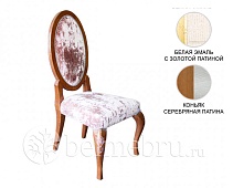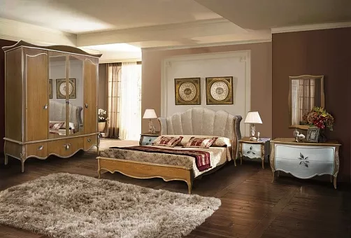 Набор выполнен с использованием массива дуба и шпона на лицевых поверхностях. Украшает изделия использование двух контрастных цветов, лицевая фурнитура в виде лепестков, объёмный вид накладок ящиков. Крышка тумбы прикроватной, ножки, карниз, рамы дверей, зеркала, вертикальные бруски стенок боковых из массива дуба. В ящиках вкладыши облицованные тканью.