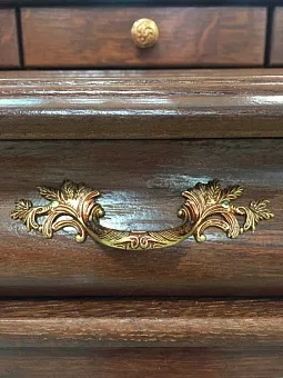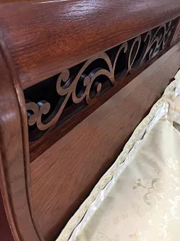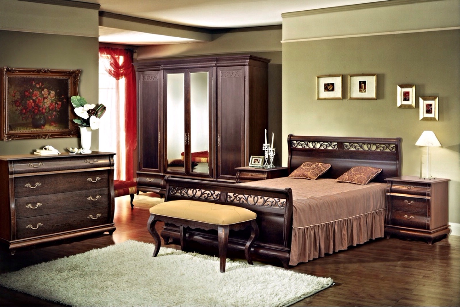 Изогнутые линии, искусно вырезанное кружево из дерева, налёт старины делают спальню безупречно красивой, солидной, удобной. Кроме классического варианта — шкаф, кровать, тумба прикроватная, комод, здесь Вы найдёте и многофункциональный туалетный стол с трёхстворчатым зеркалом – трильяж, и банкетку, и сундук на котором приятно сидеть и можно хранить постельные принадлежности.