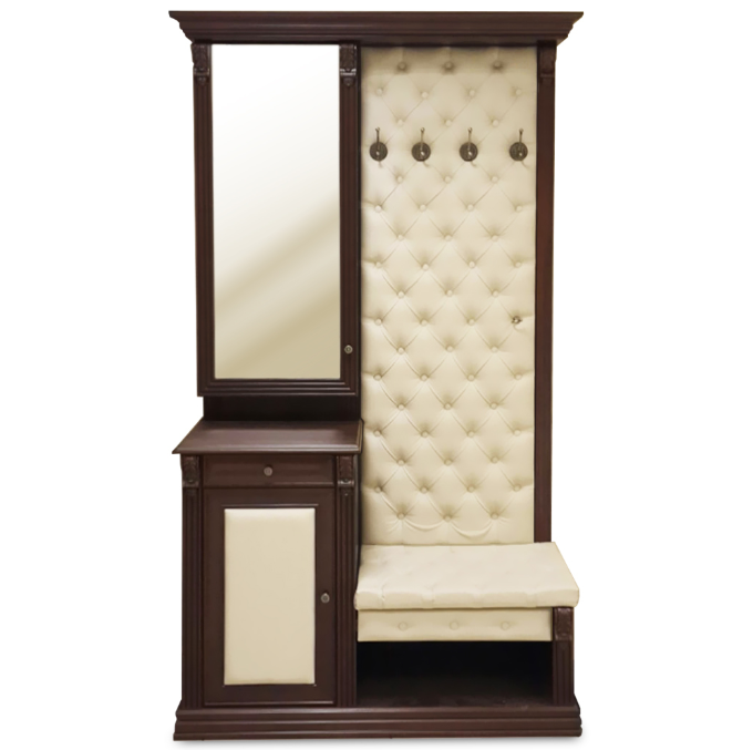 Прихожая "Франклин" из массива дерева сочетает в себе компактность, функциональность и изысканную красоту. При своих небольших размерах в ней есть всё необходимое. Мягкое сидение-пуфик для удобства, тумбочка с выдвижным ящиком и зеркало, в которое видишь себя по пояс. Изящества прихожей добавляют рельефный багет и декоративные элементы. Тумба ШхГхВ: 50х45х75 см