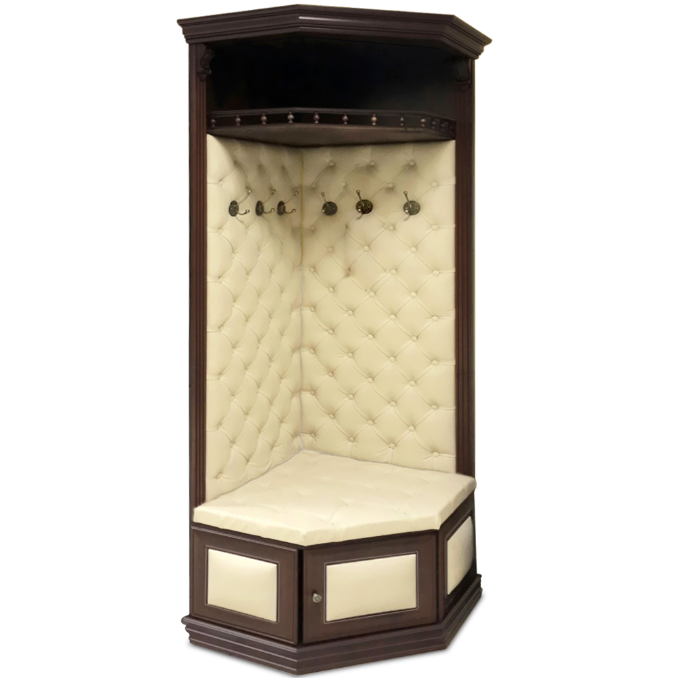 Угловая прихожая "Рассел" из массива дерева сочетает в себе компактность, функциональность и изысканную красоту. При размере 100 на 100 см в прихожую "Рассел" может поместиться довольно много верхней одежды. Угловое мягкое сидение, под которым вместительная тумба. Крючки для одежды металлические. Полка для головных уборов с декоративными балюстрадами. Верх прихожей завершает красивый фигурный багет. Высота сиденья: 45 см