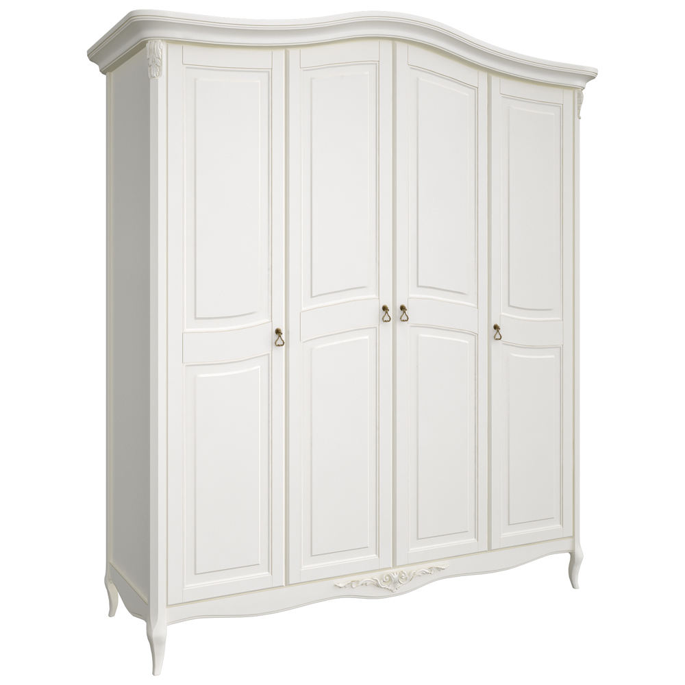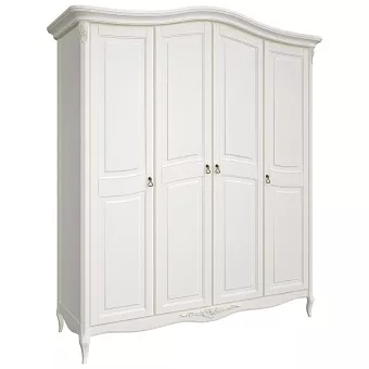 Отличительная черта этого четырехстворчатого шкафа – стильный внешний вид и отличная функциональность. Мебель изготовлена из массива бука, который славится плавной и мягкой фактурой, а также длительным сроком службы. В качестве основного цвета используется «слоновая кость», изысканность которой подчеркивает золотая патина. Фасады отличаются оригинальной формой, а сам шкаф украшен декоративными элементами, которые имитируют художественную резьбу. Возможно изменение внутреннего наполнения. Требуется сборка.